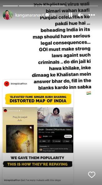 However, if you think Diljit Dosanjh is the only singer that Kangana Ranaut targeted, then the answer is ‘No’. The actress, in her other Instagram story, shared the picture of a post in which it was reported that popular singer, Shubh had shared the burning picture of India’s map. While sharing the picture, Kangana penned a note where she slammed the singer and wrote a long note atop it. An excerpt from the same can be read as: