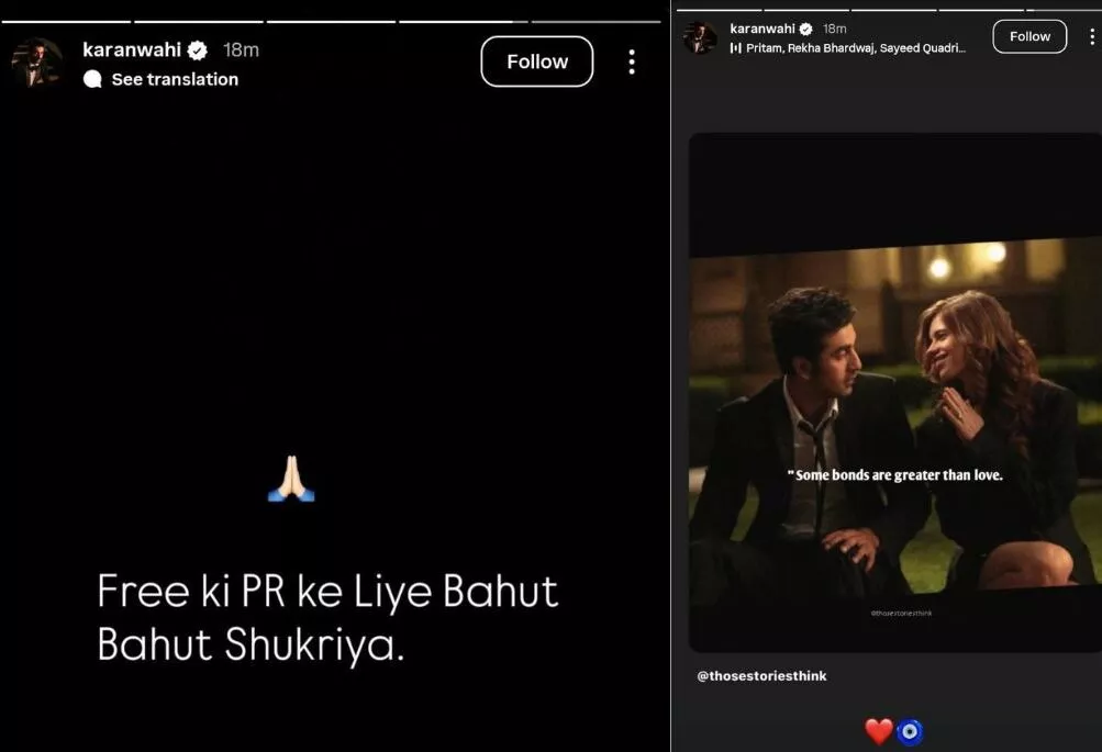 After reports surfaced of Karan Wahi and Jennifer Winget's alleged marriage plans, he took to social media to clarify the rumours. Setting the record straight, the Hate Story 4 actor wrote on his Instagram Stories that he was glad to receive "Free ki PR." In another Story, Karan shared a shot from Yeh Jawaani Hai Deewani, featuring besties 'Bunny' (Rabir Kapoor) and 'Aditi' (Kalki Koechlin). Fans saw it as Karan's way of confirming that he and Jennifer were just friends. He also told Hindustan Times that it's "fake news" and told SCREEN, "Don't know where this came from, but it's not true." Karan's IG posts were captioned as:
