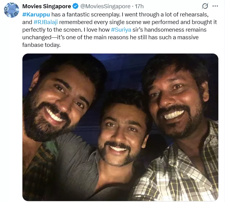 "I'm very CONFIDENT about #Karuppu. #RJBalaji has crafted a film packed with fun, energy, and entertainment. He made the producer’s job much easier and ensured a very comfortable process. The movie is on a grand scale and CARRIES a complete festival vibe. Big thanks to #GKVishnu for his work. This marks #SaiAbhynakkar’s 1ST BIG TAMIL MOVIE—we’re excited to bring it to audiences."