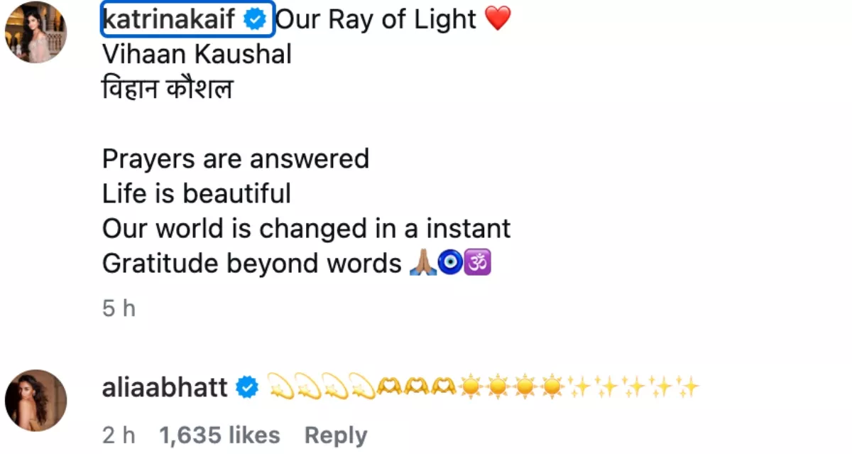 As soon as Katrina and Vicky posted a picture of their baby boy, the internet flooded with best wishes. However, Katrina Kaif's ex-boyfriend, Ranbir Kapoor's wife, Alia Bhatt, also made sure to shower her love on the actress's baby. Interestingly, Alia posted a lot of sun emojis in her comment, which literally spell out Katrina's baby boy's name.