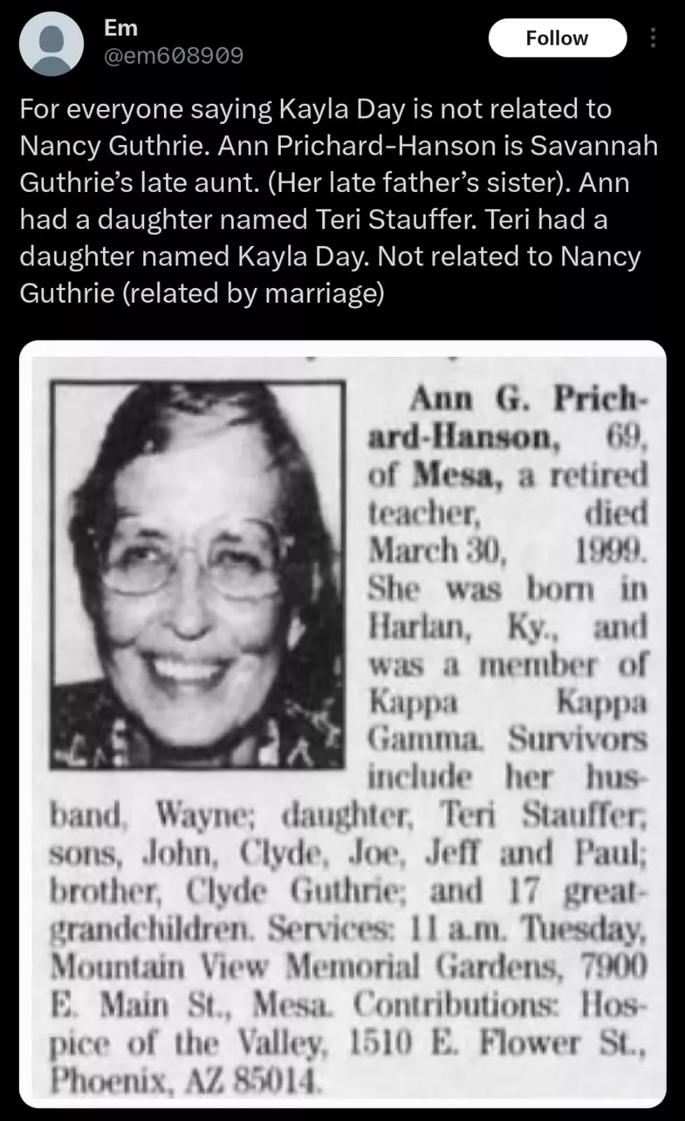 An X (formerly Twitter) user wrote, "For everyone saying Kayla Day is not related to Nancy Guthrie. Ann Prichard-Hanson is Savannah Guthrie's late aunt. (Her late father's sister). Ann had a daughter named Teri Stauffer. Teri had a daughter named Kayla Day. Not related to Nancy Guthrie (related by marriage)." Amid the online speculation, Hindustan Times confirmed that the individual being linked to the case as Nancy Guthrie's purported niece has no connection with her disappearance. Additionally, the claims that Nancy and Kayla are relatives are not unverified.