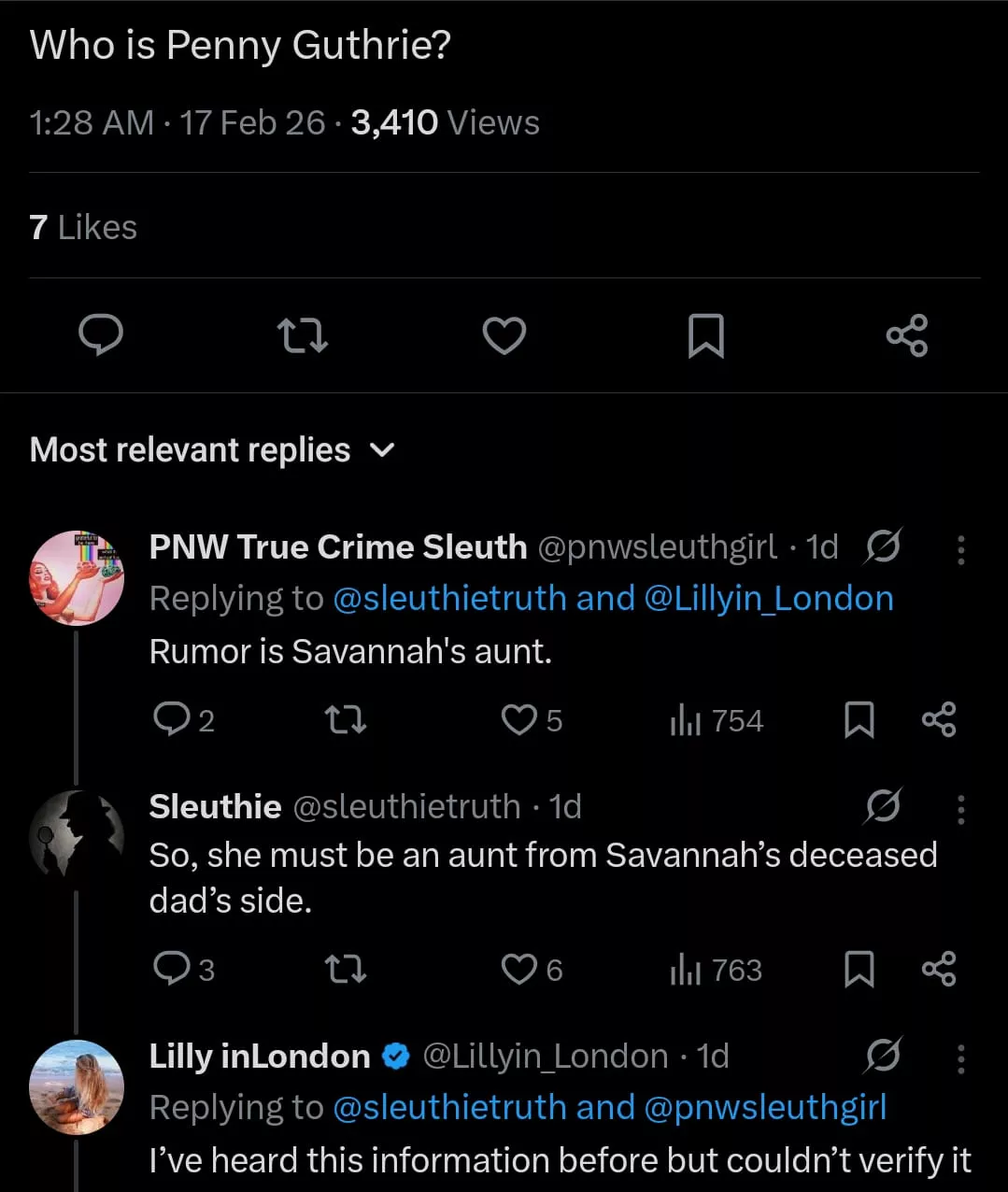 Speculation surrounding Kayla Noel Day's alleged link to the Guthrie family began on platforms like X (formerly Twitter) and Reddit after reports of former's detention emerged on February 12, 2026 (ET). Journalist, JLR shared a video on his YouTube wherein a man, claiming to know the Guthries, told him that Kayla is the daughter of Nancy's sister, making her Savannah Guthrie's cousin. The source alleged that Nancy's sister and Kayla's mother is named Penny Guthrie, whose maiden surname might be Day as most of her relatives were Days. Some contradictory social media rumours indicated that Penny might actually be Savannah's aunt, not her mother, but her deceased father's side.