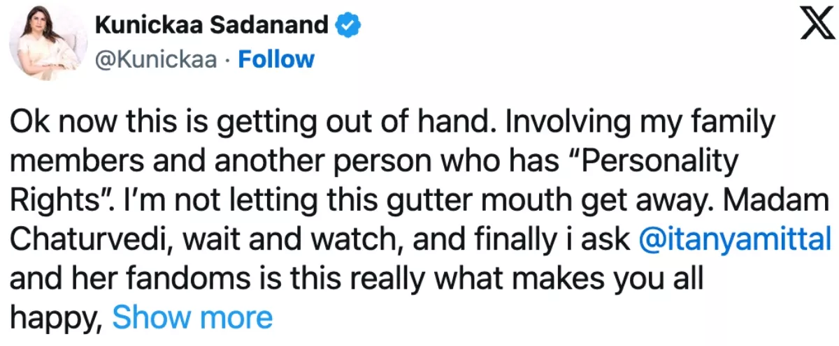 "Ok now this is getting out of hand. Involving my family members and another person who has “Personality Rights”. I’m not letting this gutter mouth get away. Madam Chaturvedi, wait and watch, and finally i ask @itanyamittal and her fandoms is this really what makes you all happy, and gloat over your popularity or vicious strength."
