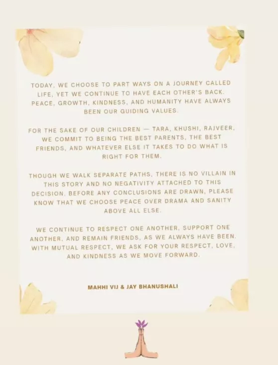 “Though we walk separate paths, there is no villain in this story and no negativity attached to this decision. Before any conclusions are drawn, please know that we choose peace over drama and sanity above all else. We continue to respect one another, support one another, and remain friends, as we always have been. With mutual respect, we ask for your respect, love, and kindness as we move forward. Mahhi Vij & Jay Bhanushali."