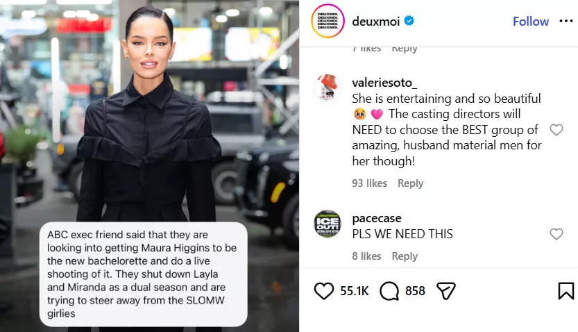 While the blind remains unconfirmed, Maura Higgins' response to Deux Moi's post has sparked further speculation. In response to the post, the Irish TV personality replied with an eye emoji, leaving fans even more intrigued about whether she would be part of The Bachelorette.