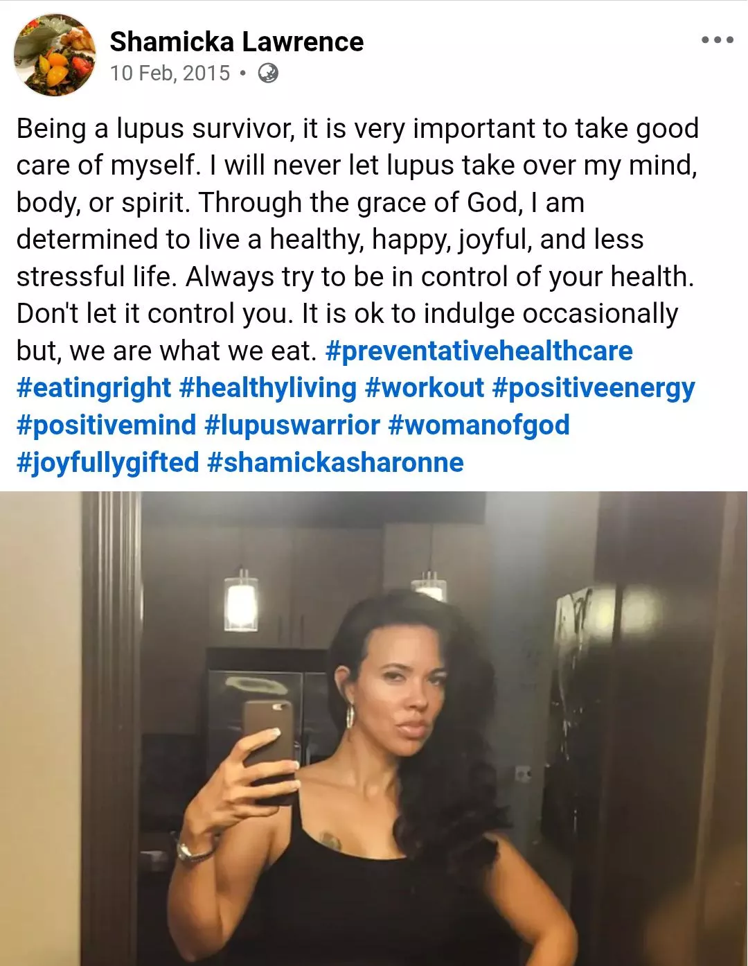 "Being a lupus survivor, it is very important to take good care of myself. I will never let lupus take over my mind, body, or spirit. Through the grace of God, I am determined to live a healthy, happy, joyful, and less stressful life. Always try to be in control of your health. Don't let it control you. It is ok to indulge occasionally, but we are what we eat."
