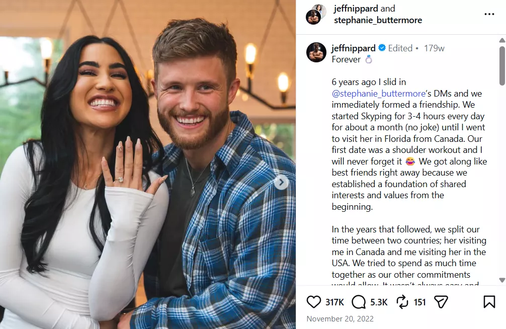"6 years ago, I slid in @stephanie_buttermore’s DMs, and we immediately formed a friendship. We started Skyping for 3-4 hours every day for about a month (no joke) until I went to visit her in Florida from Canada. Our first date was a shoulder workout, and I will never forget it. We got along like best friends right away because we established a foundation of shared interests and values from the beginning....Last month, I asked Steph to marry me, and she said yes! It’s been an amazing journey of growth and love. Can’t wait for the next chapter together."