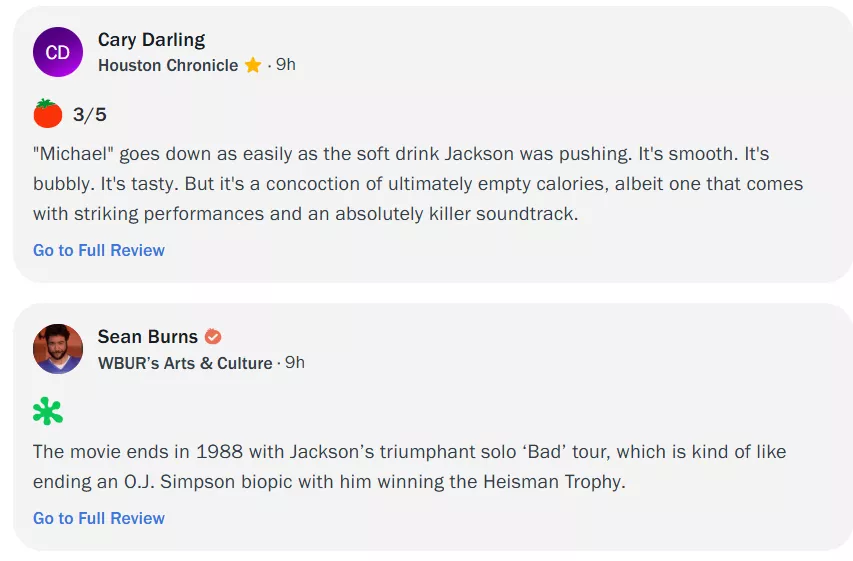 "Jaafar Jackson & Juliano Valdi channel Michael’s spirit, but the film itself only skims the surface. The big musical numbers lean heavily on CG crowds, which end up feeling hollow rather than immersive. It feels too safe and tightly controlled."