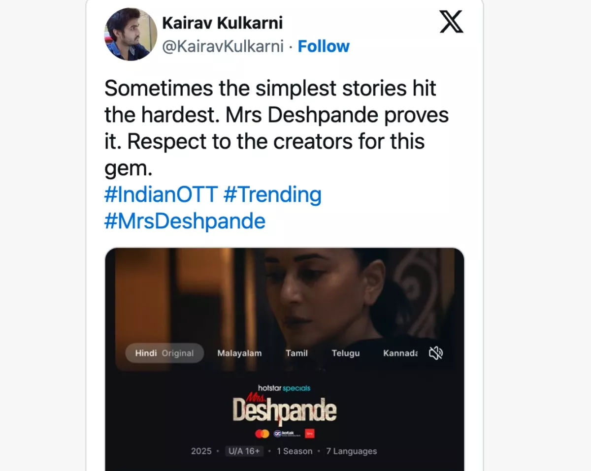 Another user praised the plot of the series, and commented, "Sometimes the simplest stories hit the hardest. Mrs Deshpande proves it. Respect to the creators for this gem." A third netizen penned, "Finally, a storyline that doesn’t rely on over-the-top drama but delivers solid impact. Word of mouth hi enough hai — go stream it." A fourth user wrote, "Her subtle acting, placid expression, velvety voice, sarcastic smile, her mute narrative speaks well for her character she had played."