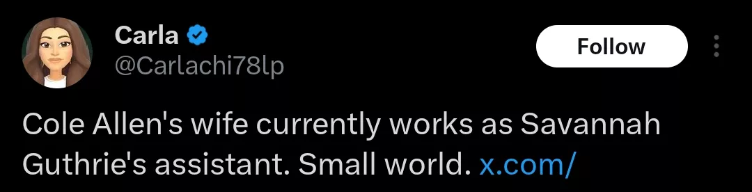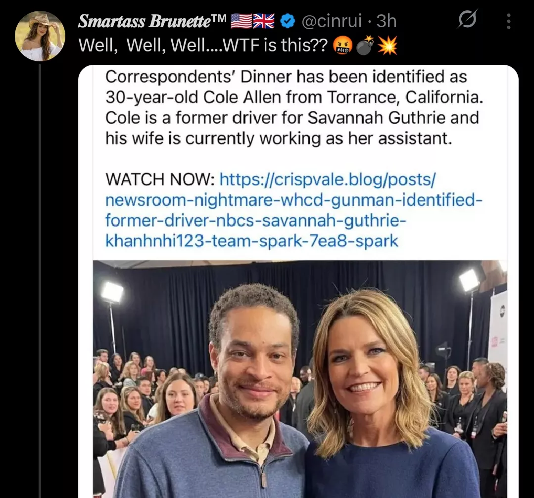 Cole Tomas Allen and his alleged wife's links with Savannah Guthrie were based on viral online posts that emerged following the April 25, 2026, shooting incident at the White House Correspondents' Dinner (WHCD). An online user wrote on X (formerly Twitter) that "Correspondents' Dinner has been identified as 30-year-old Cole Allen from Torrance, California. Cole is a former driver for Savannah Guthrie, and his wife is currently working as her assistant." The original poster also shared a blog post by crispvale, which included the information. The post quickly went viral with commenters saying it was a "Small world" that connected those individuals.