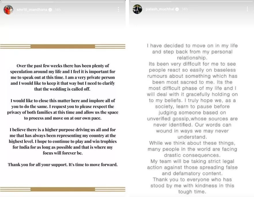 Smriti stated that her focus would remain on a "higher purpose", which is representing India in cricket and bringing home more trophies like the women's team's recent World Cup win. Palaash's statement also echoed similar sentiments, mentioning, "I have decided to move on in my life and step back from my personal life." He was troubled by the "baseless rumours" circulating on social media about him and called it "the most difficult phase" of his life. He also probed legal action against people spreading "defamatory content" about him. Following Smriti and Palaash's Story updates, they unfollowed each other on Instagram and deleted most couple photos and videos from their profiles.