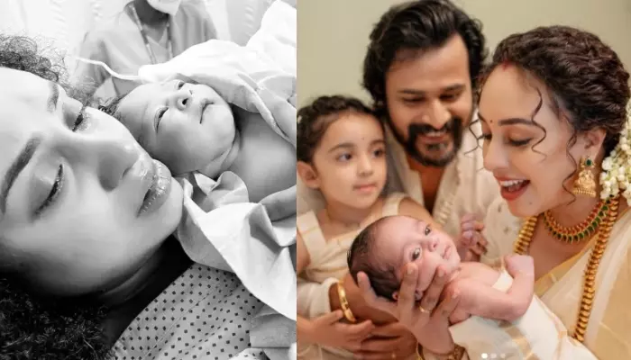 Taking to her IG handle, Pearle Maaney, in a collaboration post with her hubby, Srinish Aravind, dropped some wholesome photos from their newborn's Noolukettu ceremony. For those in Kerala, Noolukettu is celebrated on the 28th day of a child's birth, while in Hinduism, the same ceremony, which is named naamkaran takes place on the 12th day after the baby is born. Coming back to the adorable post of newbie mommy, Pearle, she revealed her baby girl's face, and oh boy, she looks adorable. In the first photo, the actress can be seen holding her younger daughter, who was decked up in a kasavu, close to her while Srinish and their elder daughter, Nila, looked at them adorably.