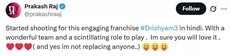 Prakash Raj took to his X account (formerly Twitter) and reacted to the buzz around him replacing Akshaye Khanna in Drishyam 3. He revealed that he has started shooting for the crime thriller and answered the much-asked question about his role in the film. Without sharing many details, Prakash clarified that he was not replacing anyone in the film. He was quoted as saying: