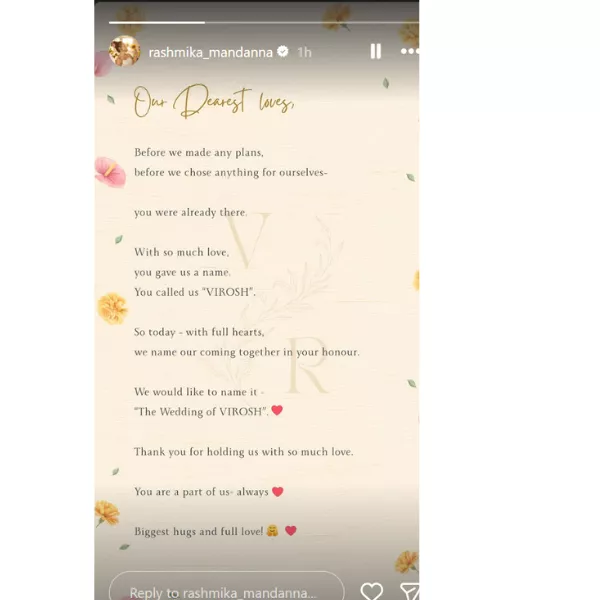 Rashmika Mandanna and Vijay Deverakonda revealed in a heartfelt note that, long before they had made any wedding plans, their fans had already given their bond deep meaning. They have named their wedding after the fan-created identity given by them and ensured that they are not mere spectators but full supporters. The couple's sweet gesture is a strong testament to the belief that this great milestone was achieved entirely because their fans stood by them at all times. Rashmika Mandanna and Vijay Deverakonda, on their Instagram Stories, formally confirmed their wedding by writing: