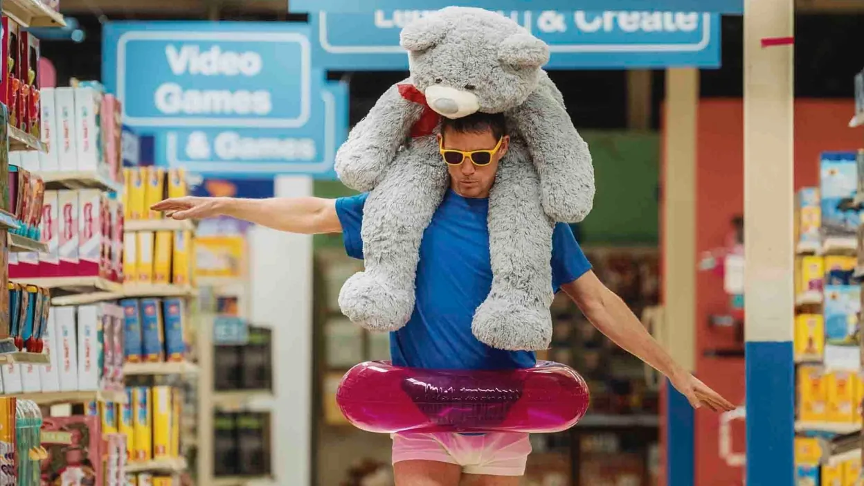 45 years is apparently too long, which leads 'Jeffrey' to smuggle himself out via the undercarriage of a semi-truck. He sits on the street watching his daughter ride her bike from afar as a cop monitors her. He tries not to act suspiciously as he walks the streets, eventually hustling into a Toys 'R' Us after a cop spots him. He enters the men's room, climbs up into the ceiling, and waits it out. He sneaks out to the manager's office at night, figures out how to stop the cameras from recording, and eventually finds a big hollow display fixture where he tosses a couple of crib mattresses and a big stuffed Spider-Man so he's not lonely.