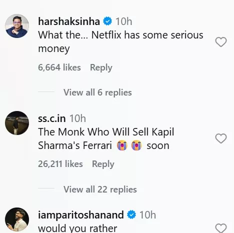 "The Monk who Sold my Ferrari... hey bhagwan not another FIR please. The Internet got chills after seeing this. Reunion we never expected. No Balraj was hurt in the making of this asset. Jab mil bethege 2 yaar, kahi ho na jaye ek aur FIR. Khatam, khalaas, Kapil Sharma show bandh hooneko hai. They’ve rigged it finally. What’s a better combination for a ‘family comedy’ show."