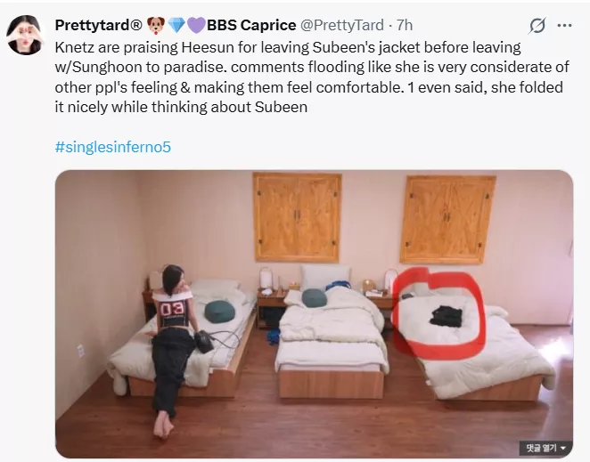 Netizens are having mixed feelings about Park and Lim's chemistry. A user wrote, "Netizens are praising Heesun for leaving Subeen's jacket before leaving for Paradise with Su Been. Comments are flooding in like she is very considerate of other people's feelings, and making them feel comfortable. One even said, she folded it nicely while thinking about Su Been." Although now it seems that a trip to Paradise has become no less than an accidental competition, even for Choi Mina Sue.