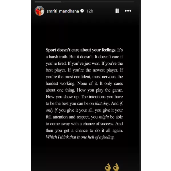 Smriti Mandhana shared a cryptic note on how the game of sports doesn't care about what one feels. The cryptic post has come after her hard-hitting knock against Australia.