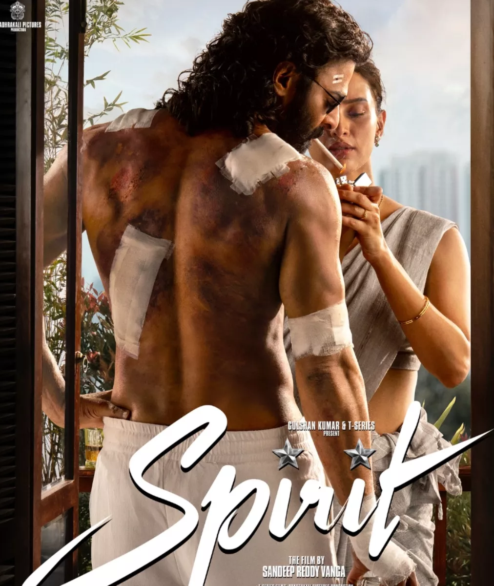 The film is directed by Sandeep Reddy Vanga, who received a lot of love for the film, Animal, featuring Ranbir Kapoor, Rashmika Mandanna, and Triptii Dimri. Now, the first poster of Spirit is making headlines. In the poster, a shirtless Prabhas stands with his back towards the camera, showing his bruises and wounds. He had bandages tied across his shoulder, back, and hands. Prabhas flaunted his long hair and a thick beard and moustache, giving a Ranbir Kapoor's character in Animal vibe. On the other hand, Triptii was seen lighting Prabhas a cigar****, while the actor held a glass of al***ol.
