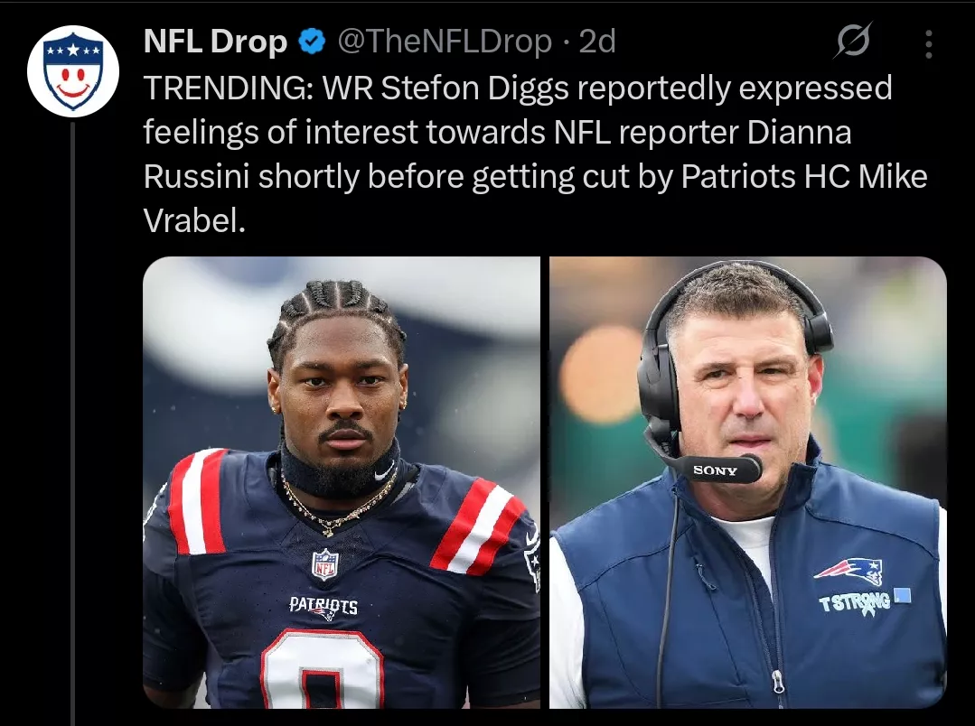 "WR Stefon Diggs reportedly expressed feelings of interest towards NFL reporter Dianna Russini shortly before getting cut by Patriots HC Mike Vrabel."