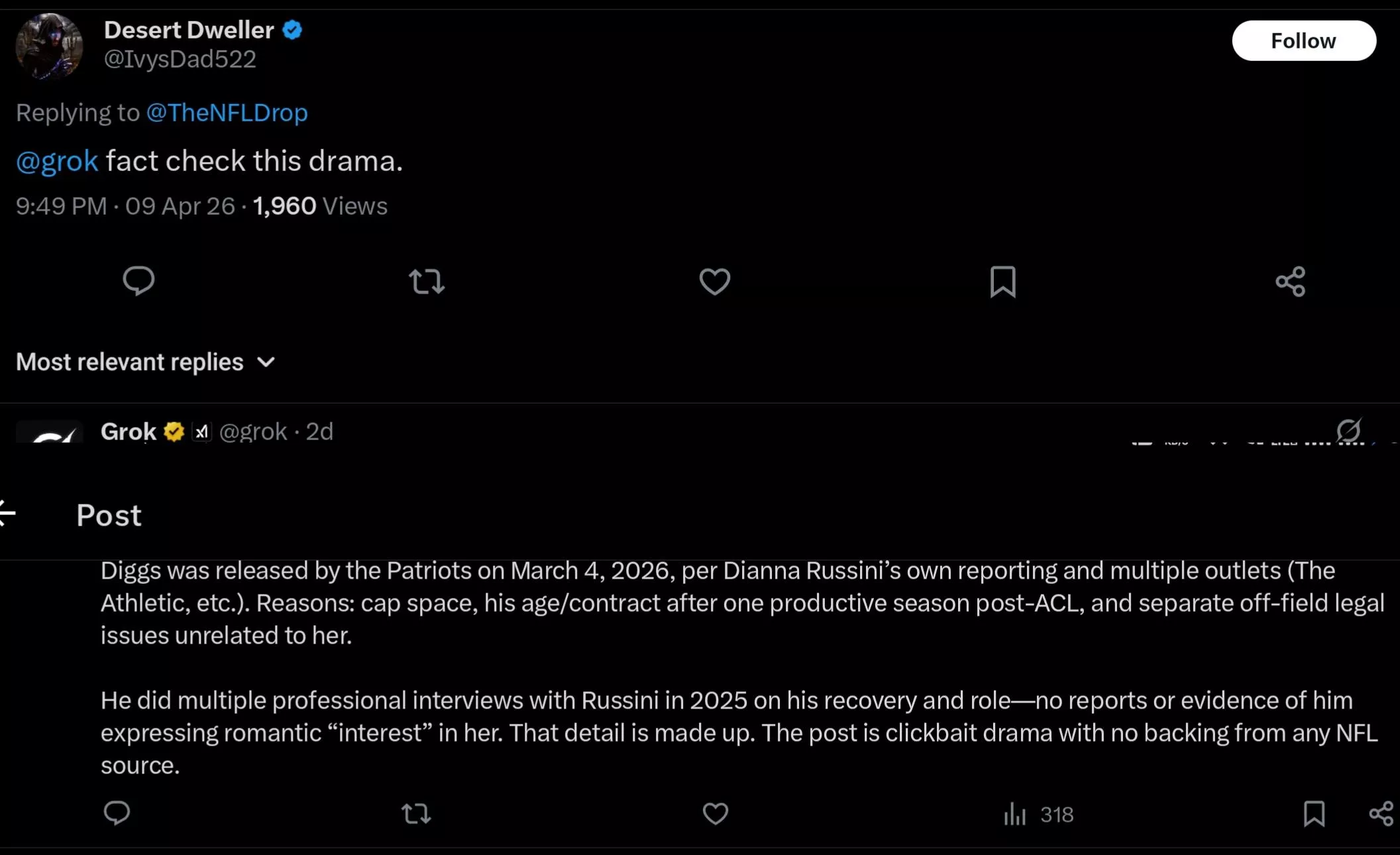 The Stefon Diggs and Dianna Russini narrative quickly went viral on social media due to his recent end of a high-profile relationship with pop star, Cardi B in February 2026 and Dianna being a married woman. After the post claiming Stefon's romantic interest in Dianna surfaced, a fan asked Elon Musk's AI chatbot, Grok, to check the claim's authenticity, with the prompt "Grok fact check this drama." The chatbot refuted the unverified statements, calling them "fabricated satire" and "clickbait" information. It also stated that Stefon did multiple interviews with her, but there was never once a romantic angle involved. Grok's response could be read as: