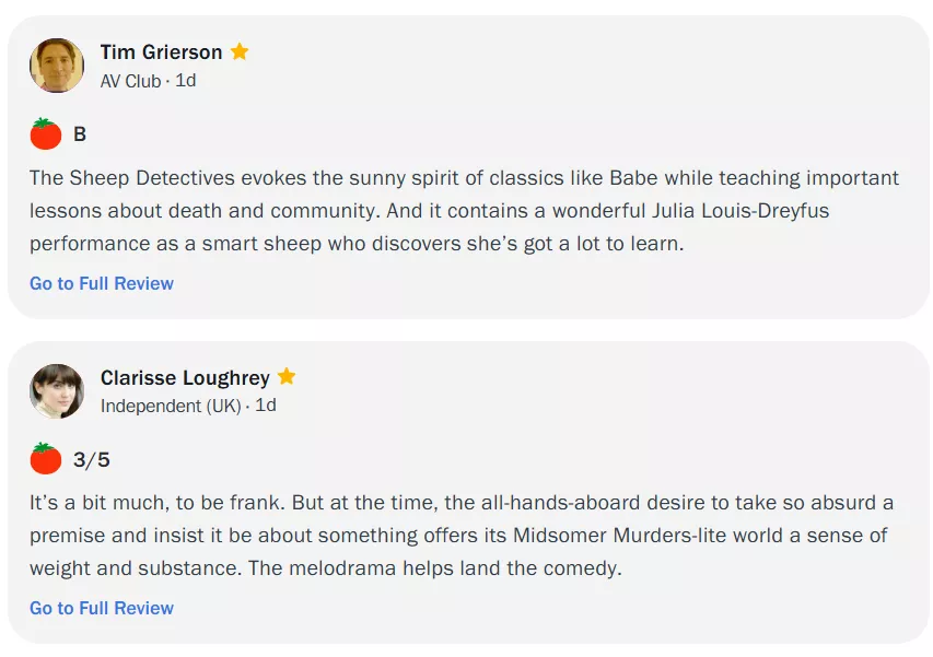 The Sheep Detectives has received a positive review from critics on Rotten Tomatoes. The film currently sits at a 94 per cent with over 33 reviews. Robert Kojder for Flickering Myth penned, "A sweet and smart family-friendly film that isn’t stupidly pandering to children, but rather engages them with worthwhile messaging and tools to draw on in and apply to more adult-oriented whodunnit books and movies." Chris Tilly from Dexerto wrote, "As well as being a satisfying whodunnit, The Sheep Detectives has much on its mind concerning life, death, grief, and trauma, resulting in a movie with a surprising amount of depth, and one that will doubtless trigger some tears between the many laughs."