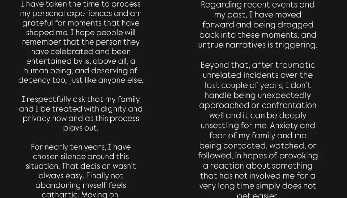 "I have taken the time to process my personal experiences and am grateful for the moments that have shaped me. I hope people will remember that the person they have celebrated and been entertained by is, above all, a human being, and deserving of decency too, just like anyone else. I respectfully ask that my family and I be treated with dignity and privacy now and as this process plays out."