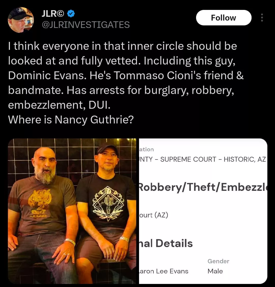 Dominic Aaron Lee Evans, a bandmate and close friend of Tommaso Cioni, has come under public scrutiny after Nancy Guthrie's son-in-law was allegedly involved in her disappearance. Tommaso and Dominic are members of the band, Early Black, which was formed alongwith Walter I. Goncalves, Jr. Dominic is currently making it to online discussions due to his past criminal record. Following journalist, Ashleigh Banfield's claims that Tommaso may be a "prime suspect" in Savannah's mother's kidnapping, social media users began calling for those in his "inner circle" to be vetted, specifically naming Dominic Evans.