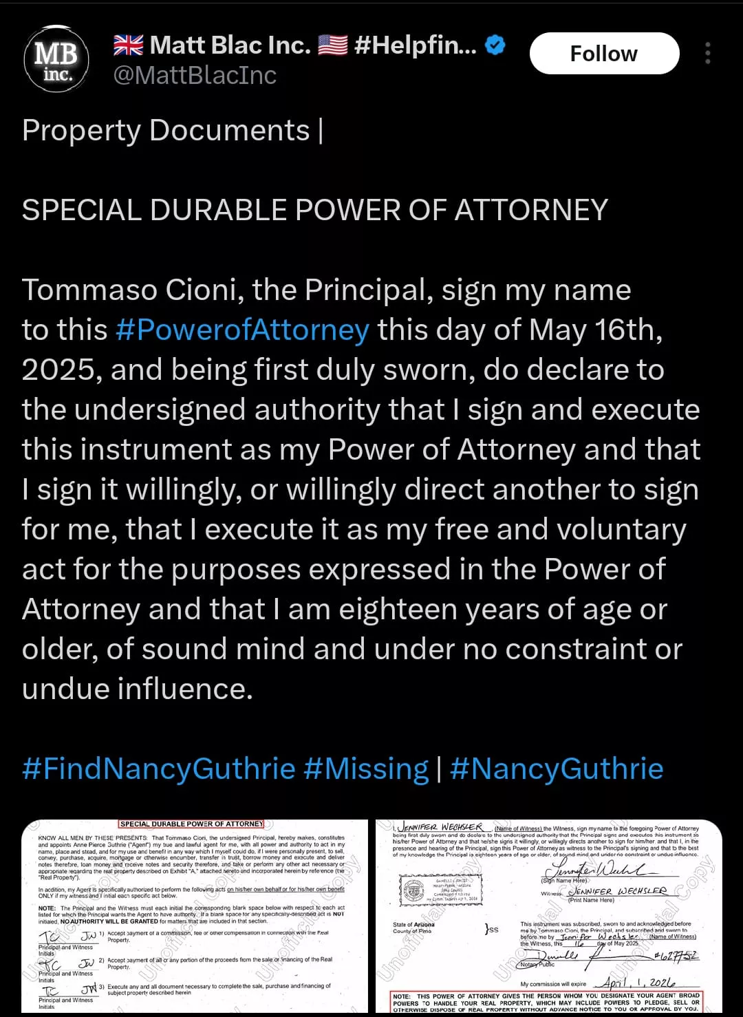 The alleged information about Tommaso raised eyebrows among some, who wondered whether he made the move to pin the blame for some real-estate-related fraud on his wife, Annie. "Some people want to blow off the power of attorney as a simple real-estate transaction, but what if some kind of disagreement came up about real estate investments, transactions? I don't dismiss anything," a concerned X user wrote. People have already made up a negative impression of Tommaso since journalist Ashleigh Banfield named him a suspect in Nancy Guthrie's kidnapping, leading to the wariness regarding the surfaced document.
