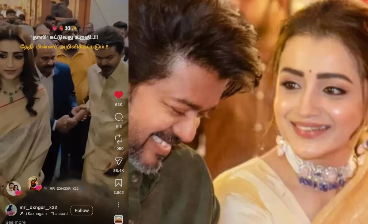 As Vijay Thalapathy's estranged wife, Sangeetha, filed a divorce petition and claimed that she wanted to part ways due to her husband's extramarital affair with an actress, all eyes were on Trisha. Now, a report first published by AsianNet claims that Vijay reportedly made an appearance with Trisha to make his relationship official. It is speculated that the actor-politician might marry soon after legally divorcing Sangeetha. Meanwhile, Trisha's mother's action in response to an Instagram post talking about the actress's marriage is making headlines.