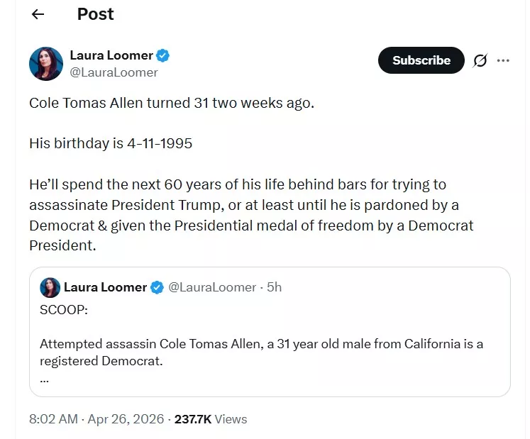 It was columnist, Karol Markowicz who had taken to X to reveal that Cole Tomas Allen, the attempted shooter is aged 31. She revealed that Cole hails from Torrance, California, and is currently in custody. Well, far-right activist Laura Loomer reportedly claimed that Cole Tomas Allen is a Democrat who had donated towards Kamala Harris' 2024 presidential campaign. Well, these political claims have not been verified by authorities.
