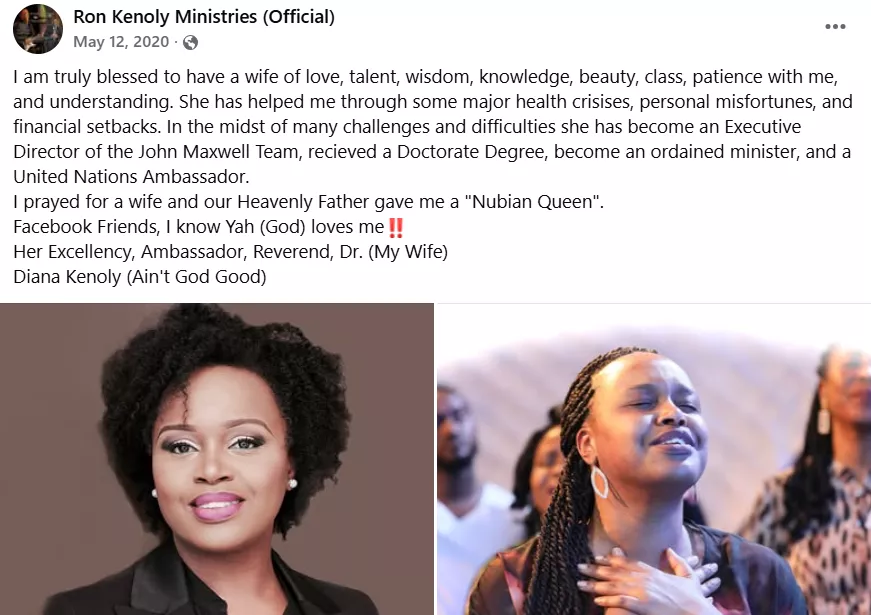 Ron Kenoly often publicly expressed his love for his wife, Diana, by speaking fondly of her. The gospel legend credited her with helping him through significant health and financial challenges during their marriage. Coming to Diana Kenoly's background, she is of Kenyan and Ugandan descent and has been affectionately referred to by Ron Kenoly as his "Nubian Queen". When he introduced his beloved second wife to the world, he took to social media and wrote: