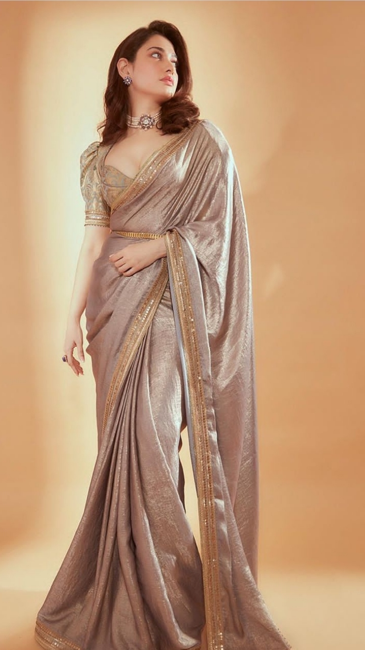 Tamannaah looked beautiful in a light brown-hued saree featuring golden borders from Tarun Tahiliani's collection. She paired it with a golden blouse, choker, stud earrings and dewy makeup.
