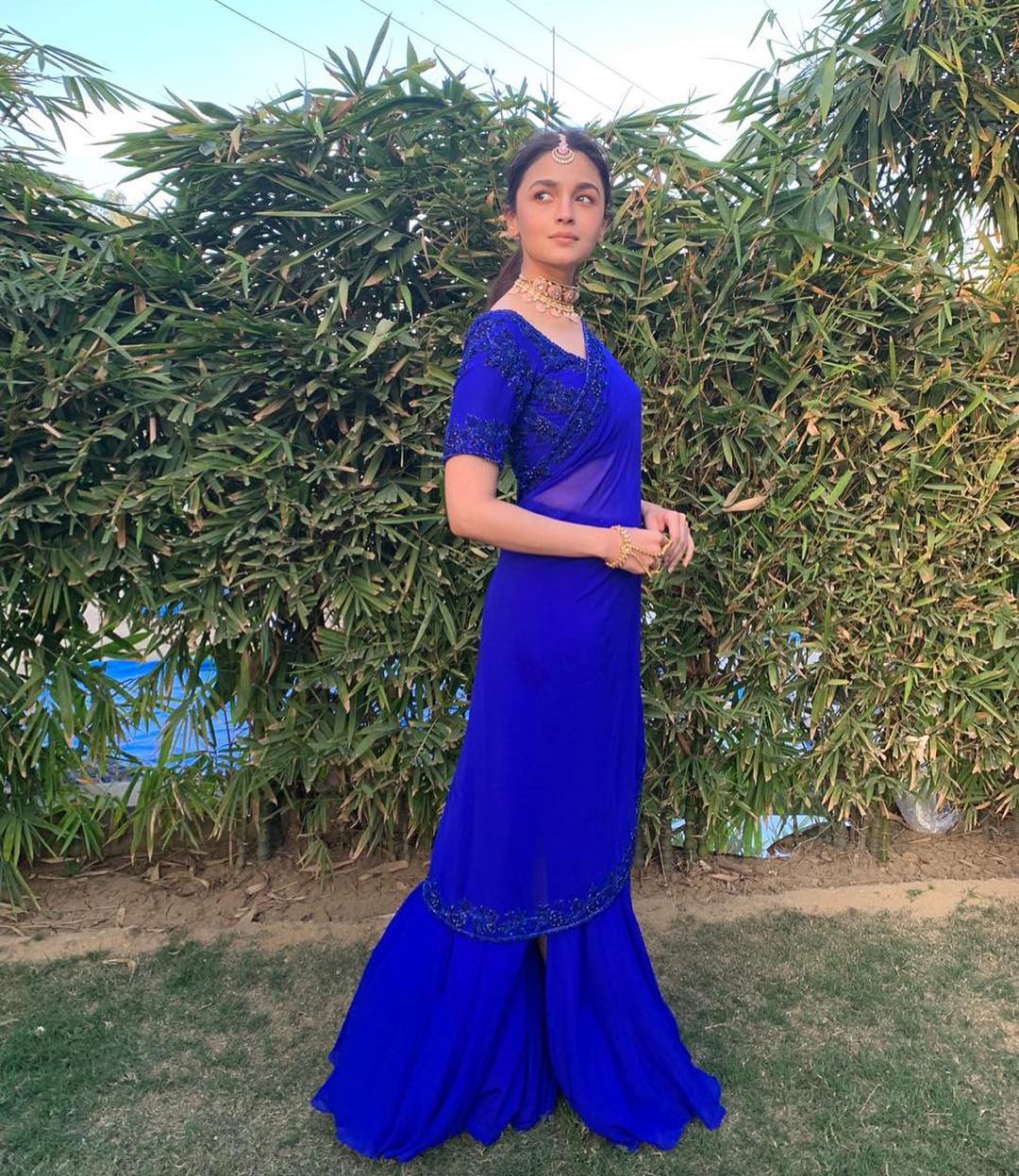 For her BFF's wedding, Alia Bhatt opted for a blue-hued 'sharara' which she paired with an embroidered blouse and a 'dupatta'. She accentuated her look with a choker necklace, and a 'maang-teeka'.