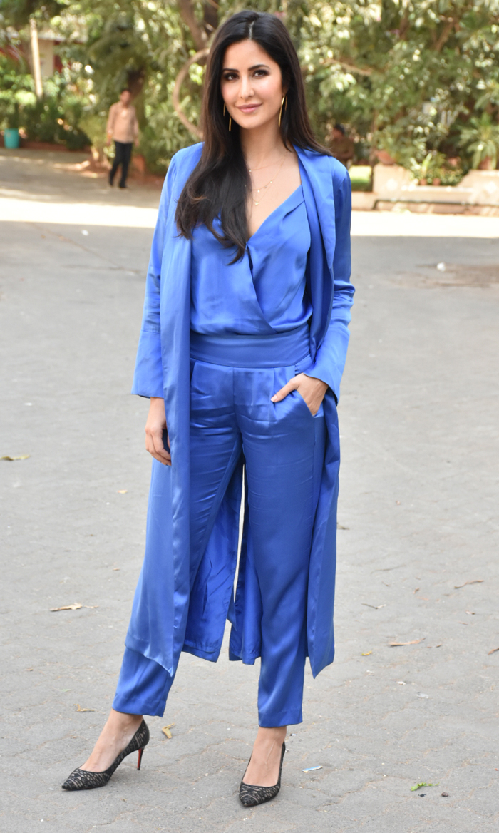 Katrina Kaif looked resplendent in a blue-coloured satin jumpsuit. She paired it with a matching -hued long shrug, a pair of golden hoop earrings, glam makeup and kept her hair open.