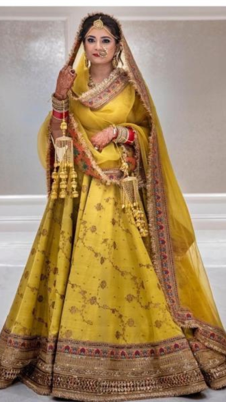 Bride, Sonya Seth opted for a corn yellow-hued Sabyasachi lehenga 'choli' for her wedding in Houston, Texas and looked no less than a queen. She completed her look with traditional jewellery.