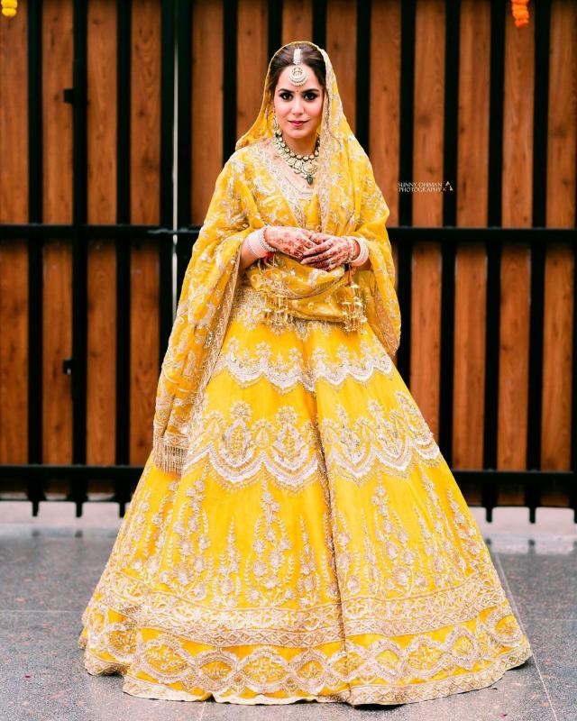 Bride, Saloni Tandon wore a chrome yellow Sabyasachi lehenga for her wedding in Lucknow, Uttar Pradesh. She paired it with a striped 'dupatta' and gold jewellery.