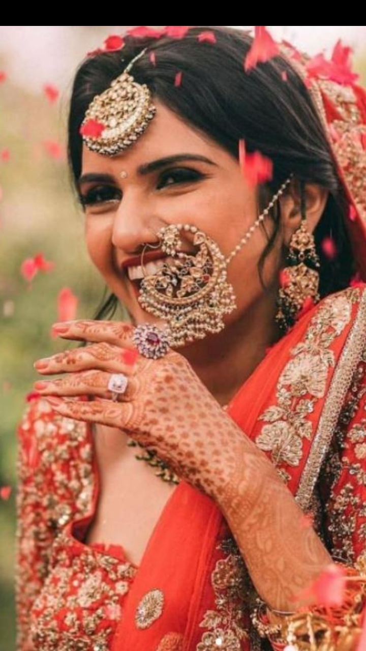 An oversized 'nath' embedded with all kinds of jewels has the ability to stand alone and grab the attention very easily. Moreover, it enhances the bridal look.