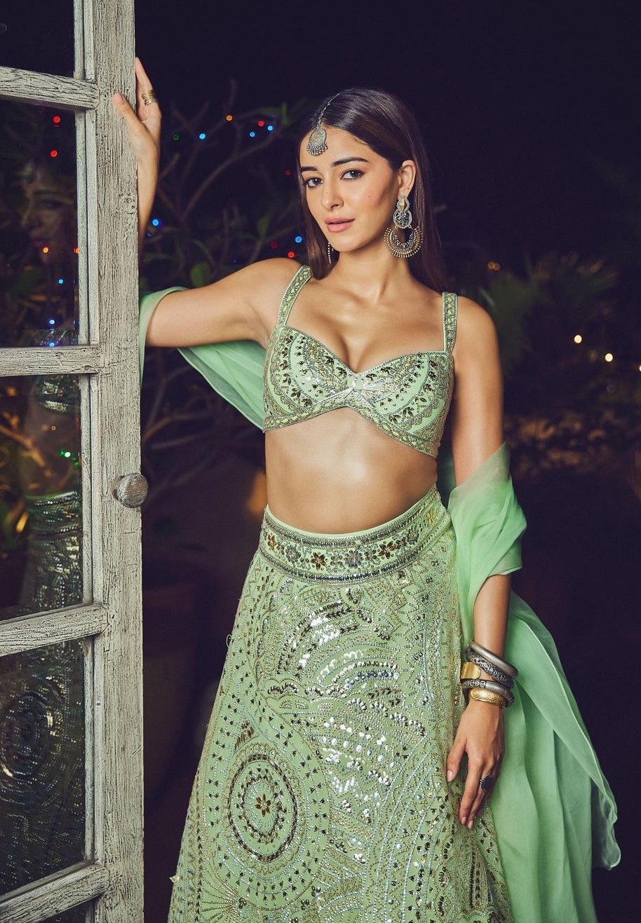 Ananya Panday flaunted her beautifully toned body in a pista green-hued lehenga featuring embroidery and sequinn work. She teamed it with a deep sweetheart neckline strappy blouse and looked stunning.