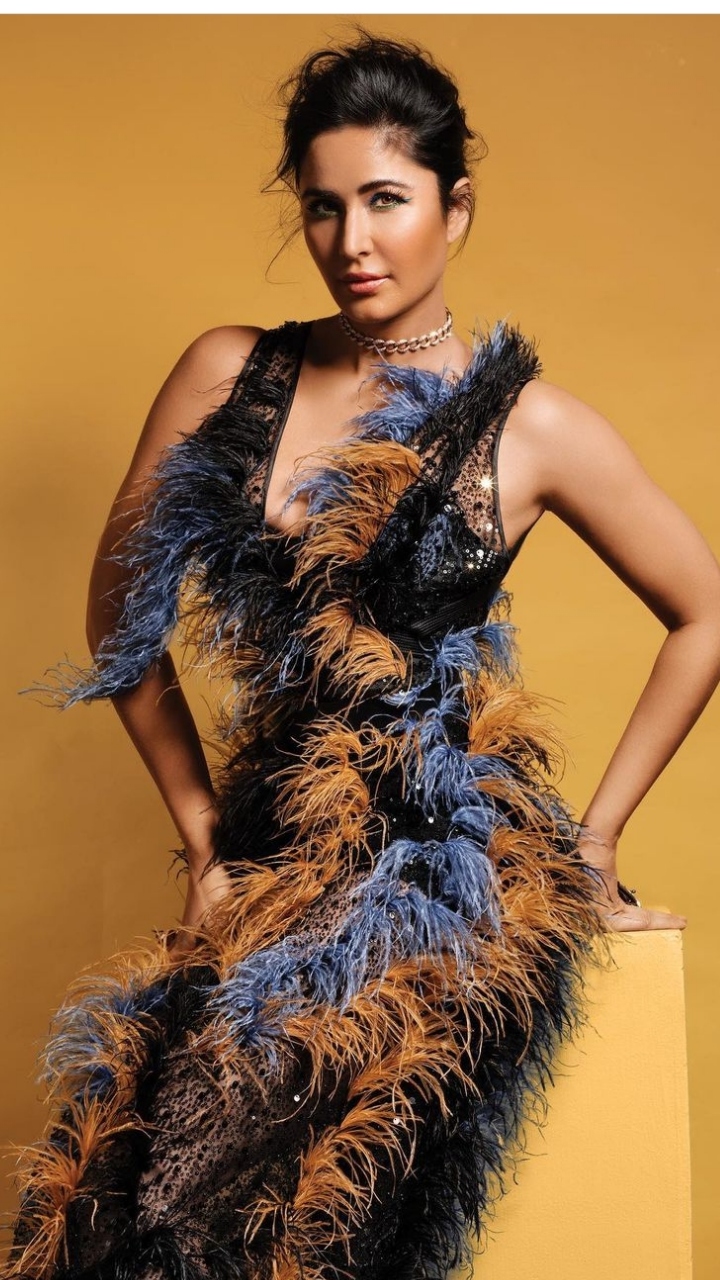 Katrina looked mesmerising in a black-hued sequin gown featuring dual-tone feather detailing. She completed her look with a choker, highlighted makeup and messy bun.