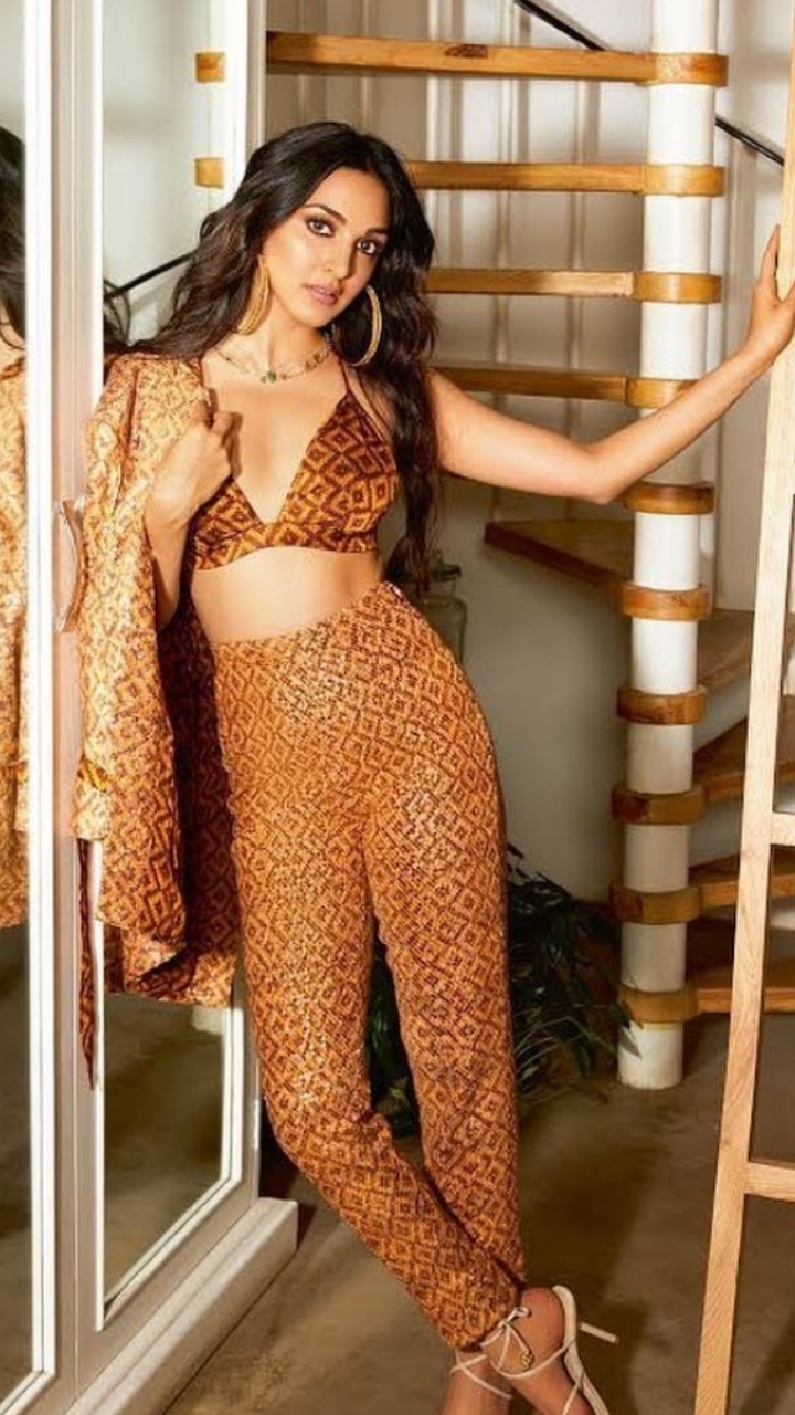Kiara looked stunning as she donned an orange-hued checkered-detailed sequin pantsuit which she paired with a matching bralette. Statement jewellery, highlighted makeup and open tresses completed her