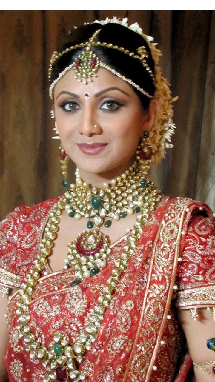 Shilpa Shetty had worn a stunning gold 'kundan' studded 'sheesh patti' styled 'maang teeka'. It had two chains attached to it, making a 'matha patti', adding a South Indian touch.