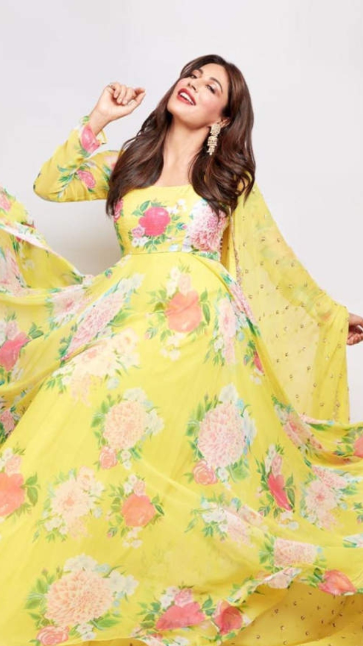 The gorgeous actress opted for a floral printed yellow-coloured Anarkali set paired with a matching 'dupatta'. Along with it, dewy makeup, statement earrings and wavy hairdo gave her a cheerful look.