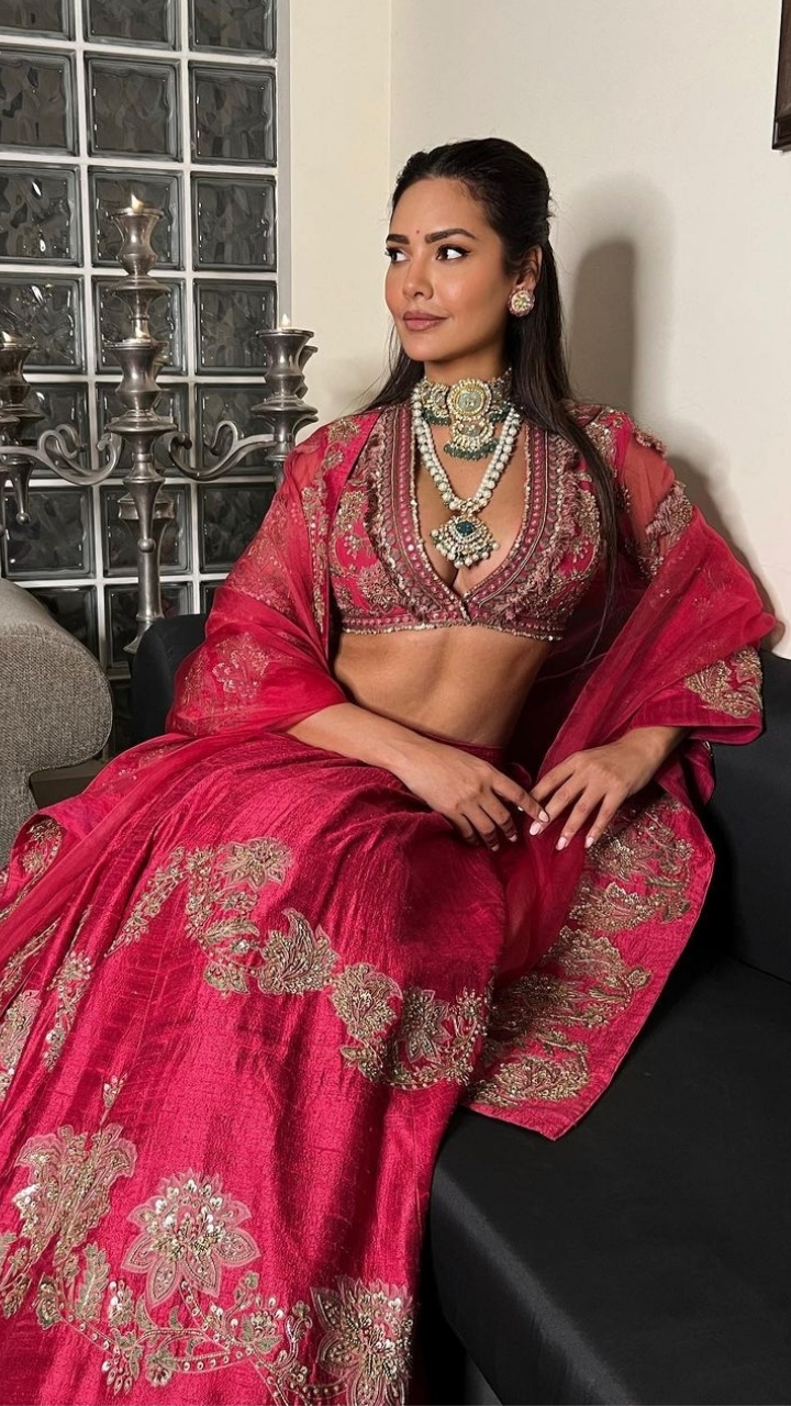 Esha exuded elegance in a 'rani' pink-hued lehenga featuring golden embroidery. She teamed it with a matching 'dupatta', 'choli', 'polki' jewellery, dewy makeup and half-tied hairdo.