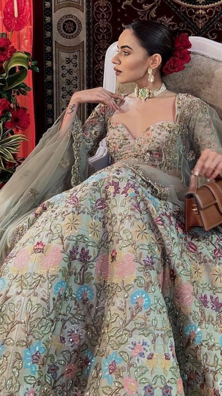 For a wedding, Komal opted for a pastel-hued lehenga that featured heavy embroidery work all over it. She teamed it with a matching blouse, sheer 'dupatta', pearl choker, and dangling earrings.