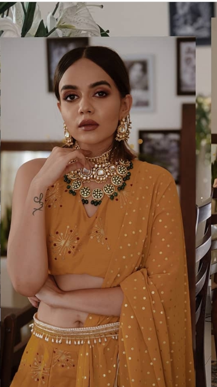 Komal once opted for a yellow-hued silk lehenga which she teamed with a matching strappy blouse and 'dupatta'. 'Polki' necklace, matching earrings, dewy makeup and open tresses amped her look.