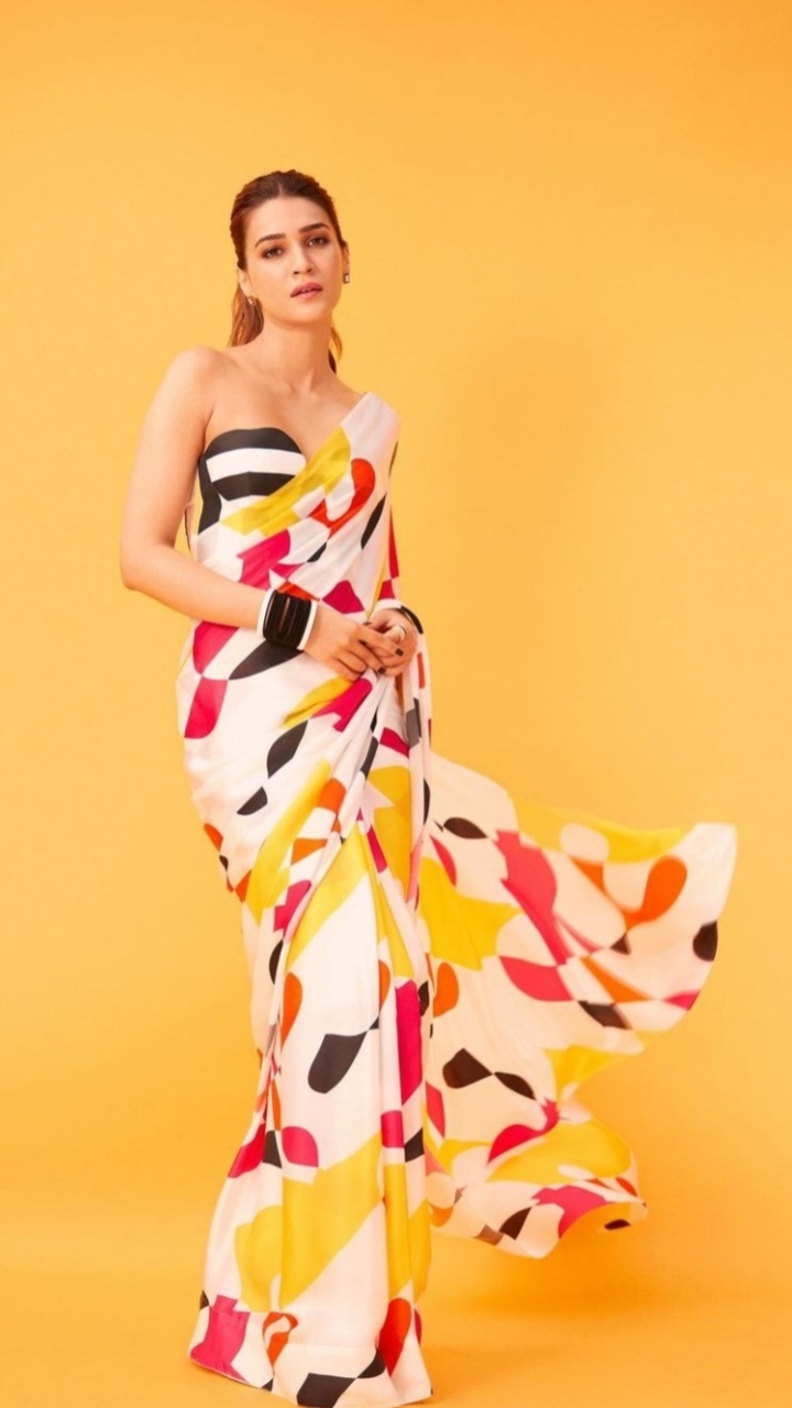 Kriti Sanon once wore a multi-coloured chiffon saree and paired it with a striped bralette. A ponytail, black bangles, stud earrings and dewy makeup completed her look.