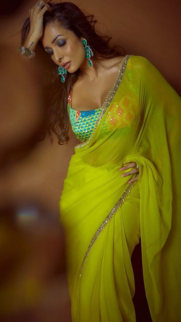Malaika donned a neon-hued plain saree featuring lace and tassel work at the hemline. She paired it with a multi-coloured sequinn blouse, emerald earrings, glam makeup and open tresses.