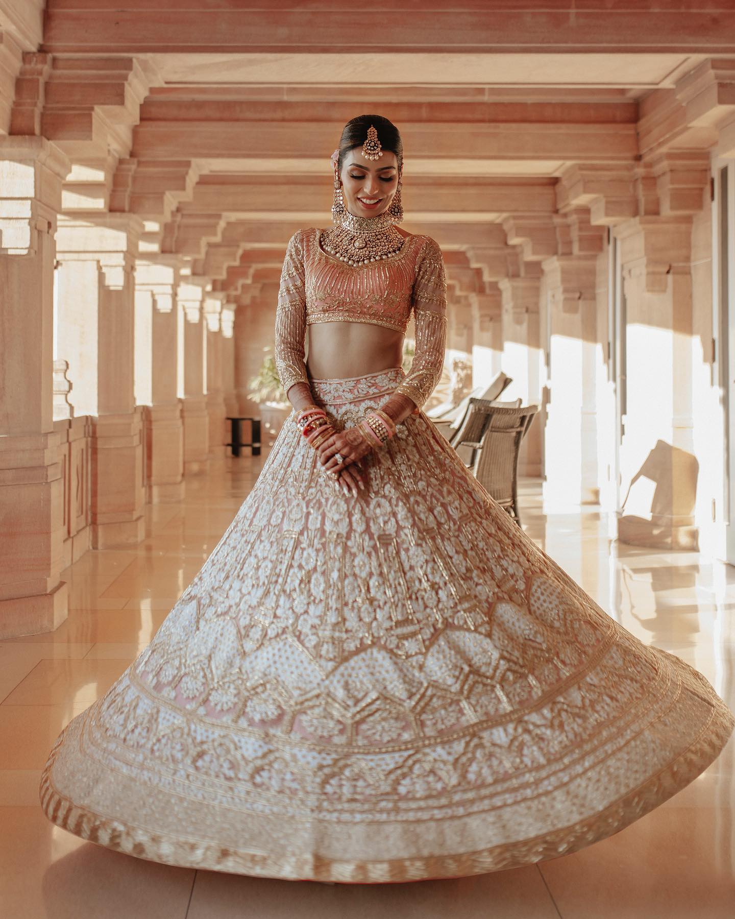 The bride chose to wear a shining number in the champagne pink-hued lehenga. The outfit features minute sequin, bead and metallic strip work all over it.