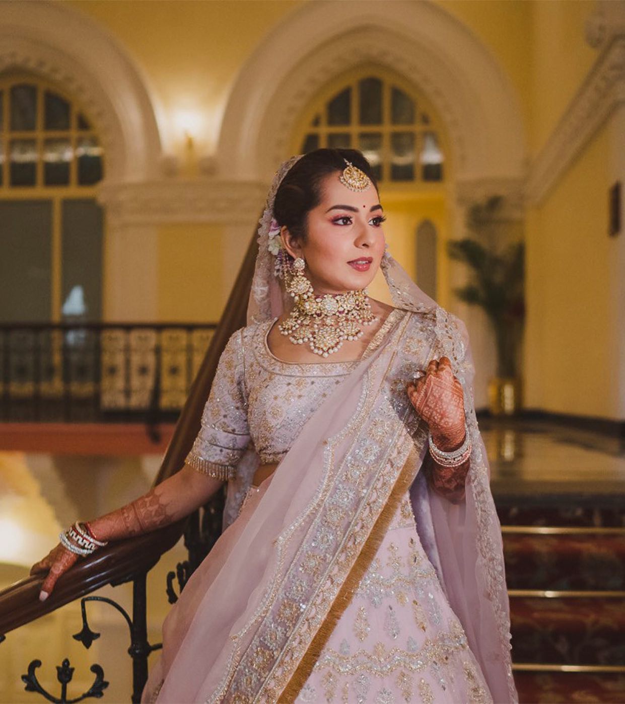 The bride donns a muted-pink, heavily embellished lehenga for her pre-wedding festivities. Her smokey eye makeup and traditional jewellery amped her look.